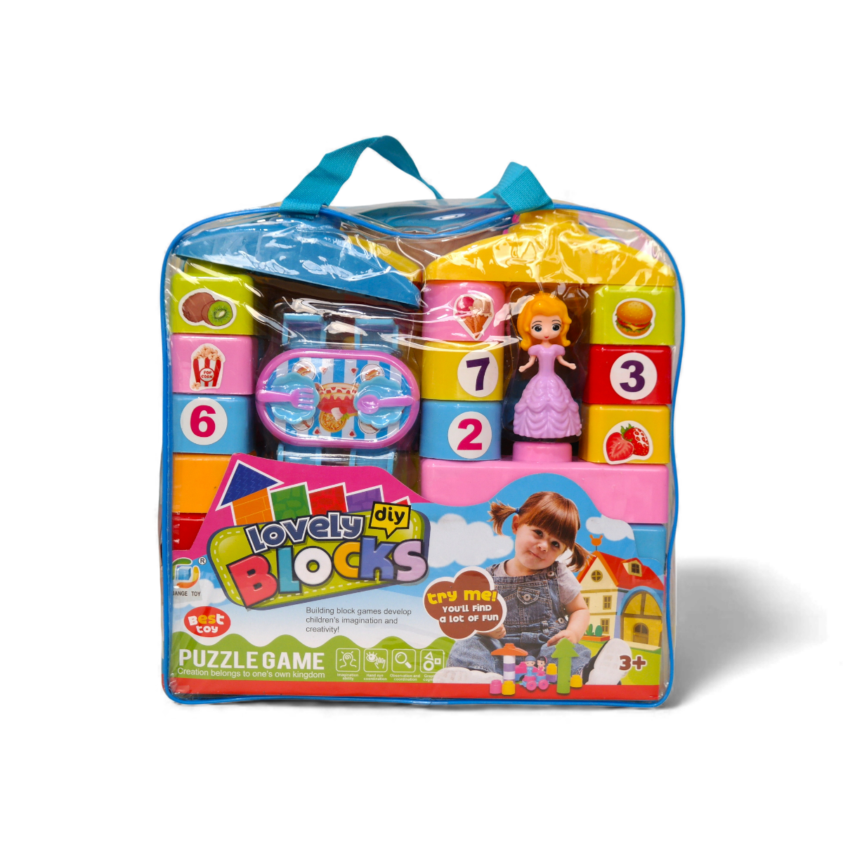 Las piezas son de plástico resistente y seguro, diseñadas para manos pequeñas. El diseño del bolso es funcional y colorido, con asas para llevarlo fácilmente y con espacio suficiente para guardar todas las piezas del set.