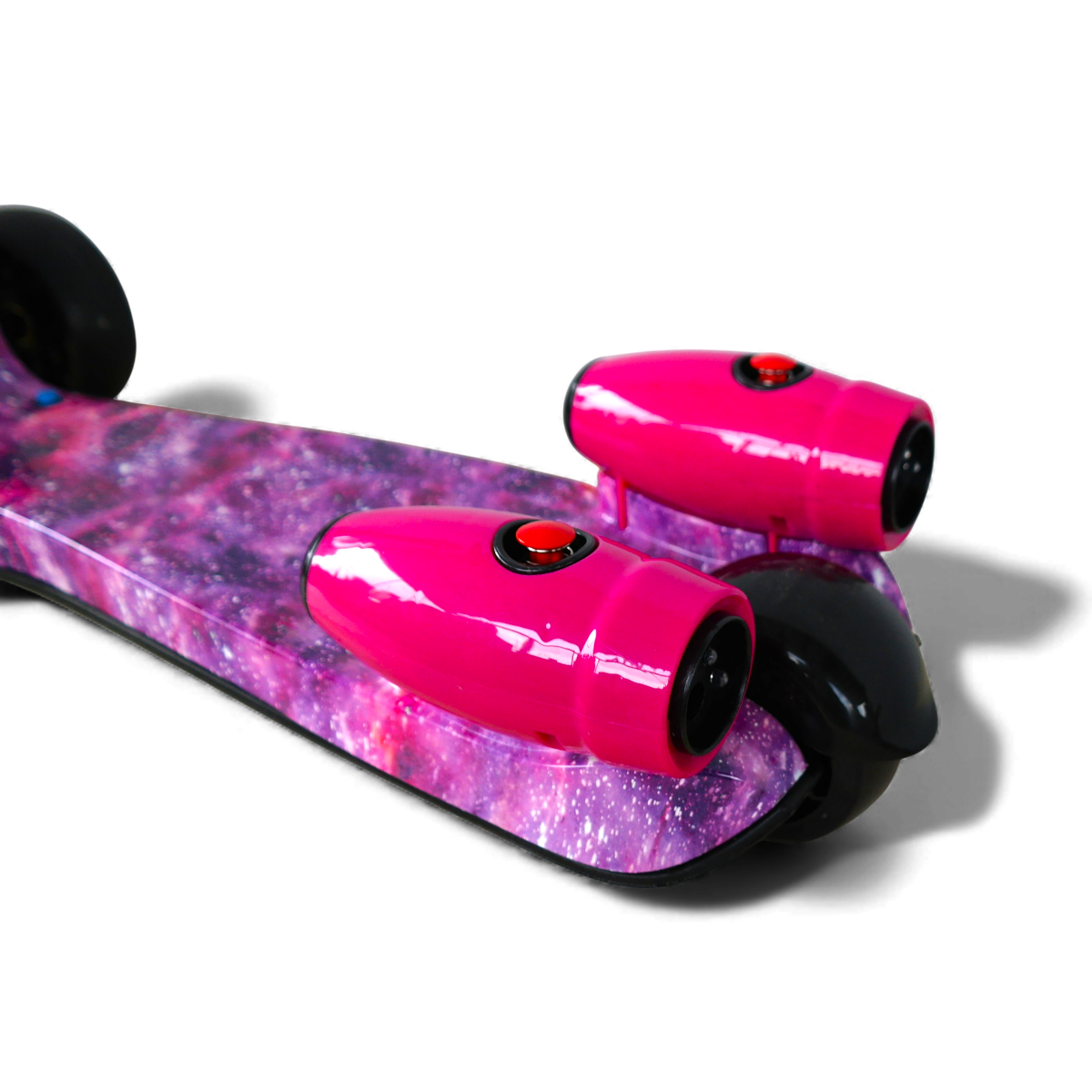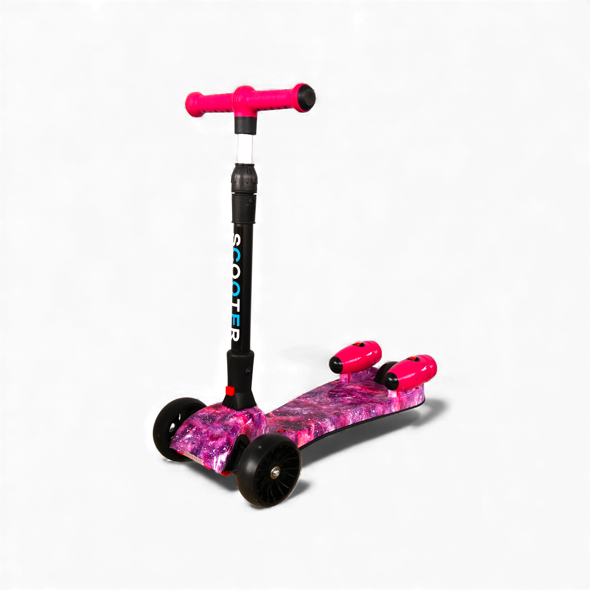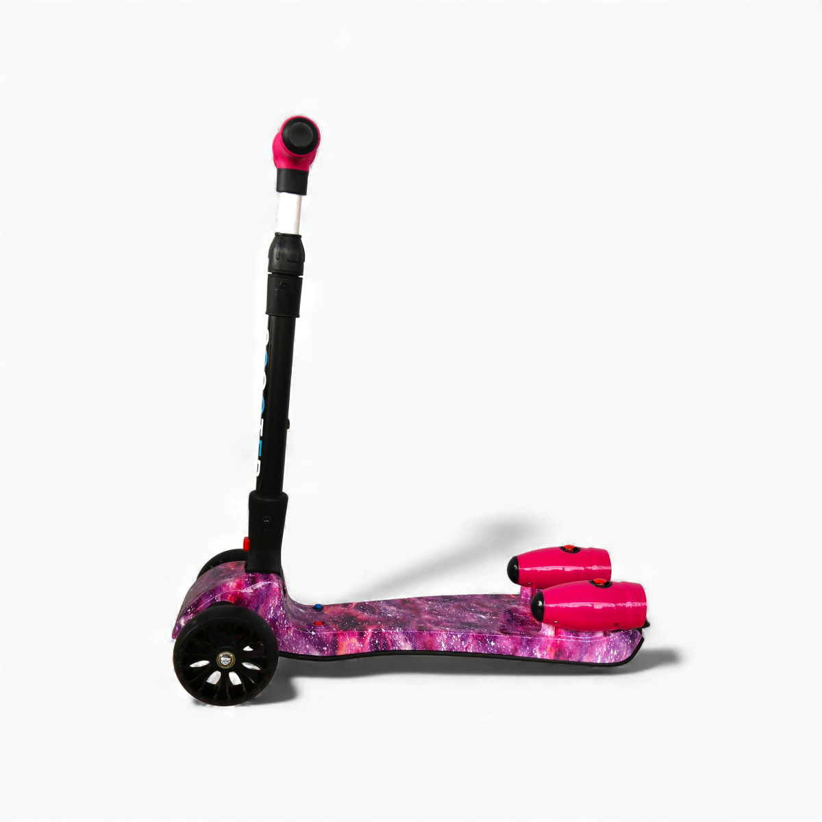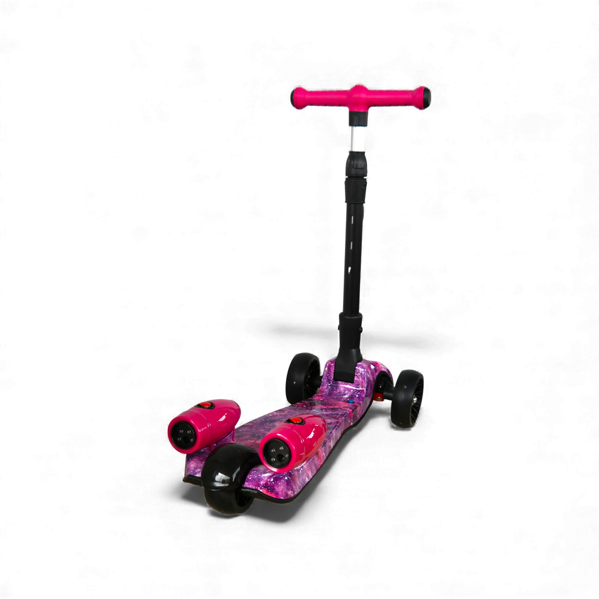 Esta increíble scooter combina diseño, luces y efectos especiales para crear una experiencia de juego única. Su estructura resistente y liviana está decorada con un acabado tipo galaxia rosa que llama la atención desde cualquier ángulo.