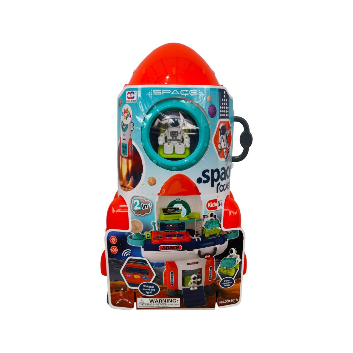 La nave se abre para revelar una base espacial llena de detalles: centro de control con pantallas, laboratorio, escalera de acceso, telescopio, antenas satelitales, y un vehículo tipo rover para explorar nuevos planetas. Incluye una figura de astronauta totalmente equipada para recorrer cada nivel del cohete.