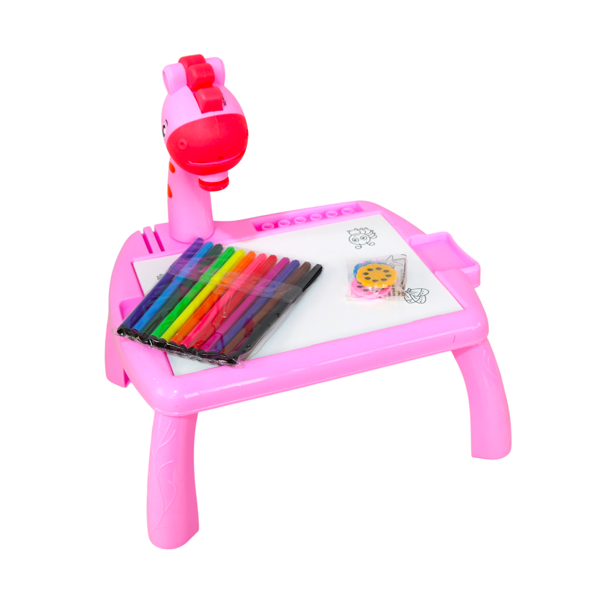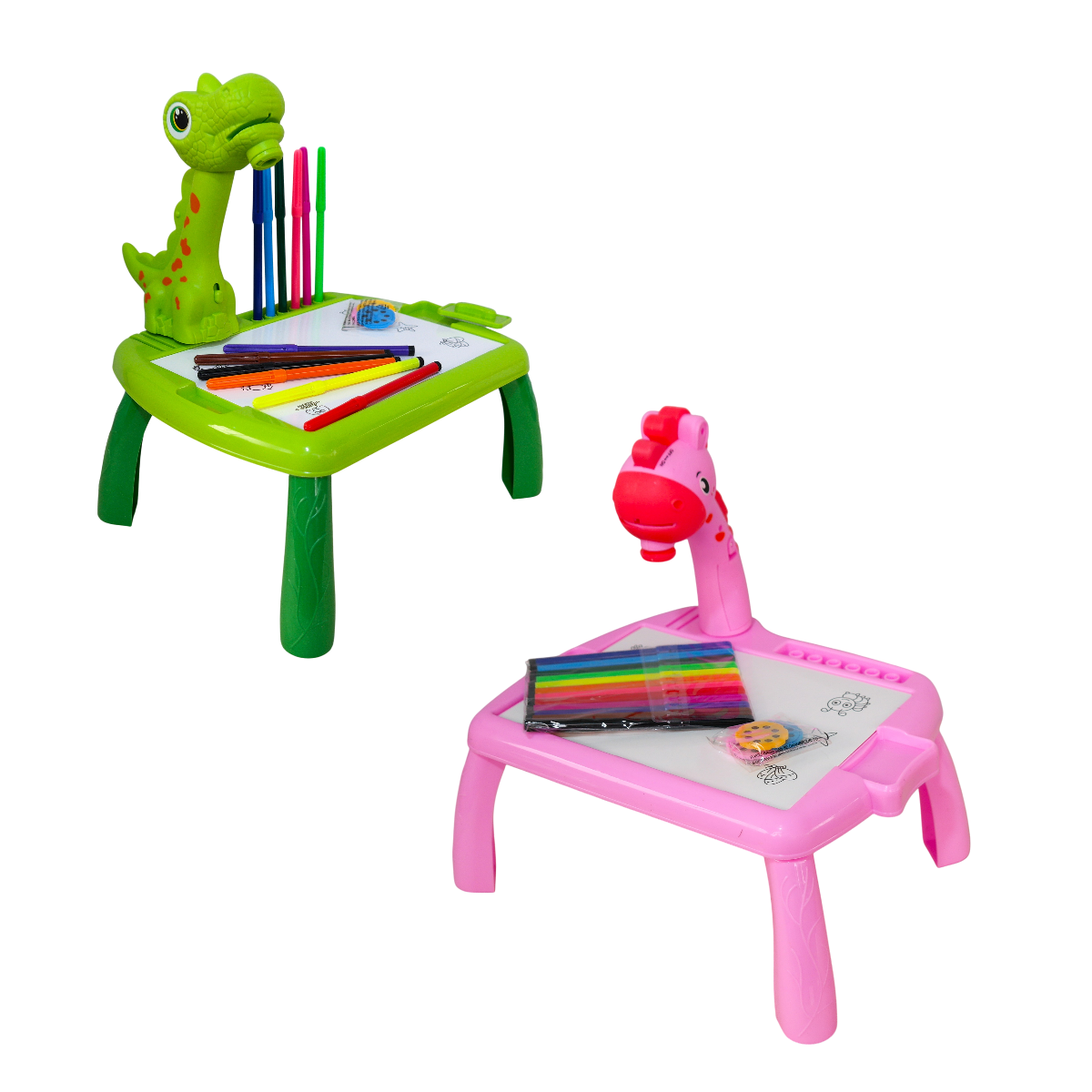 • Incluye: mesa, proyector con forma de jirafa o dinosaurio, 12 marcadores de colores, discos de proyección y libro de dibujo