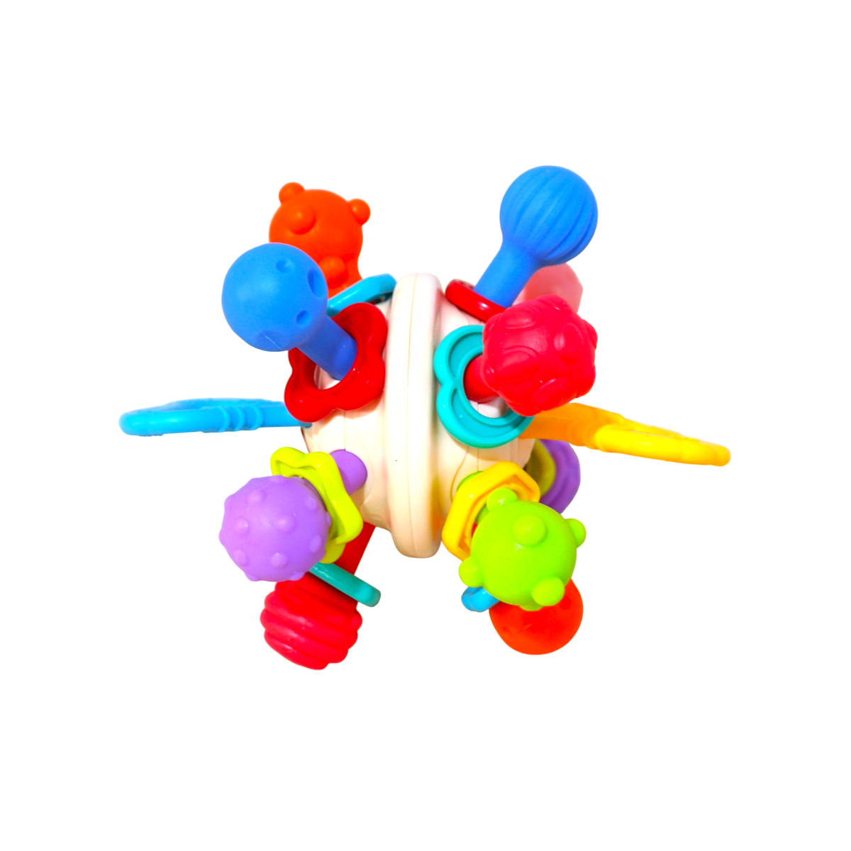 Cada extremo del sonajero ofrece una sensación diferente al tacto: superficies suaves, rugosas y con pequeñas protuberancias que estimulan el sentido táctil y proporcionan alivio durante la dentición. Al agitarlo, emite un sonido suave y agradable que atrae la atención del bebé, promoviendo la estimulación auditiva y el aprendizaje causa-efecto.